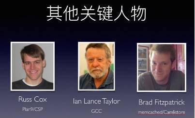 再来看看其他核心贡献者,图2中Russ Cox也是目前Go的领导者之一,他和Rob Pike一起领导Go;Ian Lance Taylor是GCC的作者之一,目前负责GCC的Go实现;Brad Fitzpatrick之前是Memcache的作者,目前主要是HTTP2的实现作者。大家可以看到这些作者都是各个领域内的顶尖高手,所以当初我相信一群牛人做出来的Go也一定够牛。