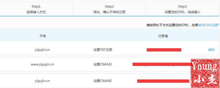 第一步选择接入方式和第二步添加、确认子域名记录就不展开说了,重点说第三步设置您的 DNS、完成接入。这一步我们得到一条 TXT 记录值和两条 CNAME 记录值,具体如下所示: