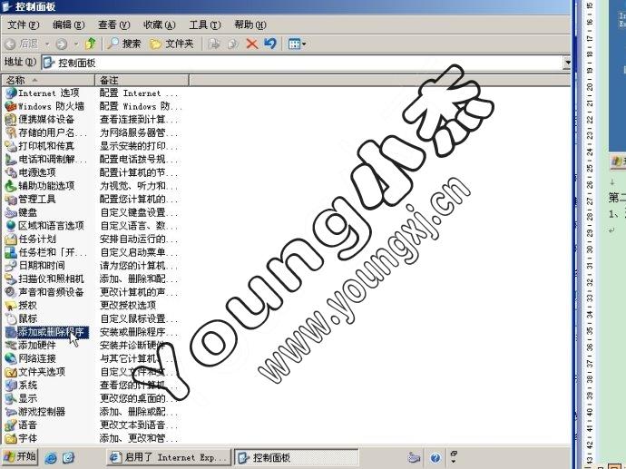 1、 进入“开始”->“设置”->“控制面板”,选择“添加或删除程序”,如图: