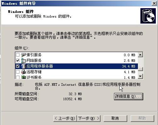 2、 选择“网络服务”和“应用程序服务器”,并进入“应用程序服务器”的“详细信息”,勾选“ASP.NET”,并继续选择“Internet信息服务(IIS)”的“详细信息”,勾选“Frontpage 2002 Sever Extensions”和“后台智能传送服务(BITS)服务扩展”,如图所示: