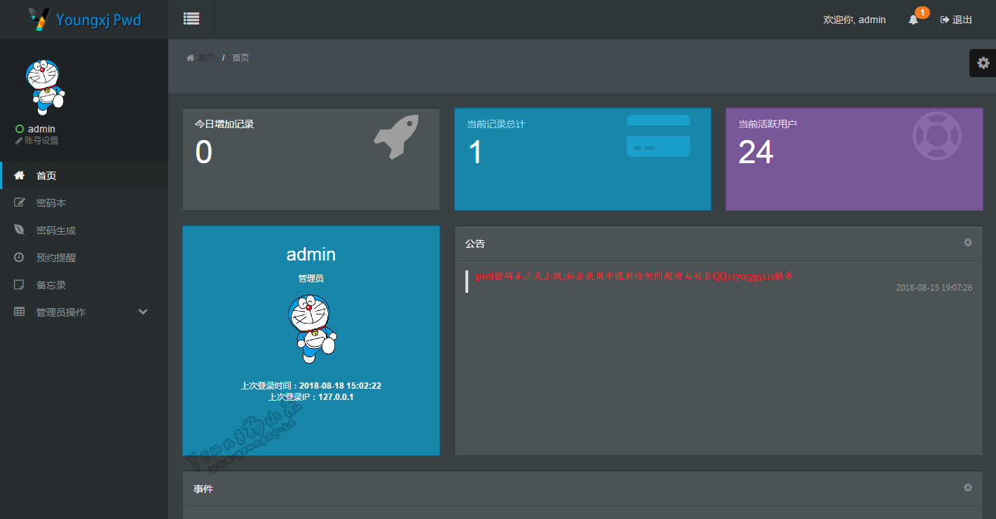 此账号请勿删除,但可以禁用,此账号是作为站长管理员的附属账号,添加的 密码本,备忘录等信息均会附属给id为1的账号,当然如果该账号没有禁用也 是可以单独使用。